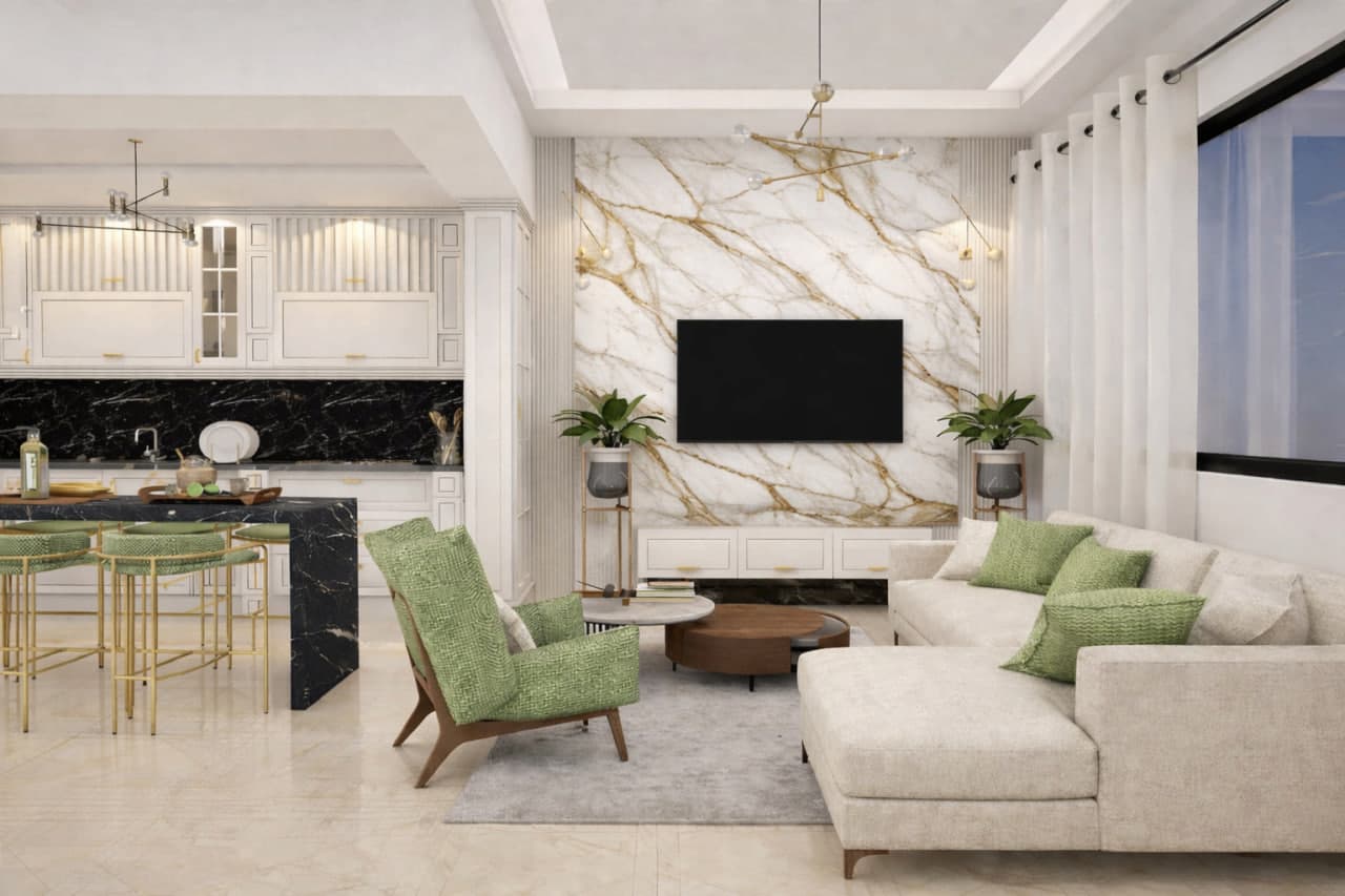 Ponúkame veľkoformátové PVC a SPC panely, akustické panely a dizajnové mramorové obklady (hrúbka 2.7 mm a 3 mm), ktoré spájajú luxusný vzhľad a vysokú odolnosť.